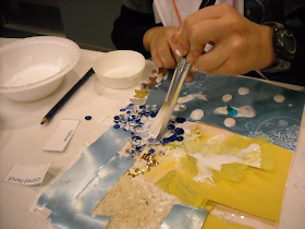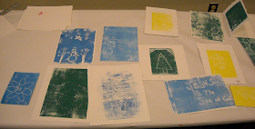 On the very same day I hosted an "art challenge," where kids got a bag of supplies which had to be used in their entirety to complete an art project. They received prizes! This one was a fantastic finished piece, and was complete before any of the others. Look at all that modge podge!