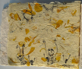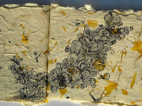 This is a wonderful little rinky-dink book made from scratch by ME. I do a very poor job of trimming things exactly, and as you will see by the photos I post, I am... shall we say... much more organic and spontaneous with my materials? This is NOT a good thing in the art world, hence why I call this rinky-dink. It is and was an experiment, and a poorly documented idea, but beautiful all the same. The pages are out of order (actually, totally backwards). The paper is hand-made from cotton pulp and marigold pettals. Ink is india, drawn by quill pen. Hand sewn.