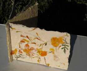 Oooh now THIS is pure joy. I made this paper by tearing up all the dead lilly leaves in my garden. I proceded to dry them for a few weeks, cook them for a day, rinse them, blend them, and syphon them out to what you see here-- sheets of fine paper. It is slightly brittle, but not terrible. It would be very nice if mixed with cotton pulp.